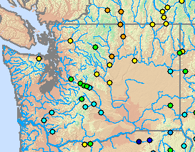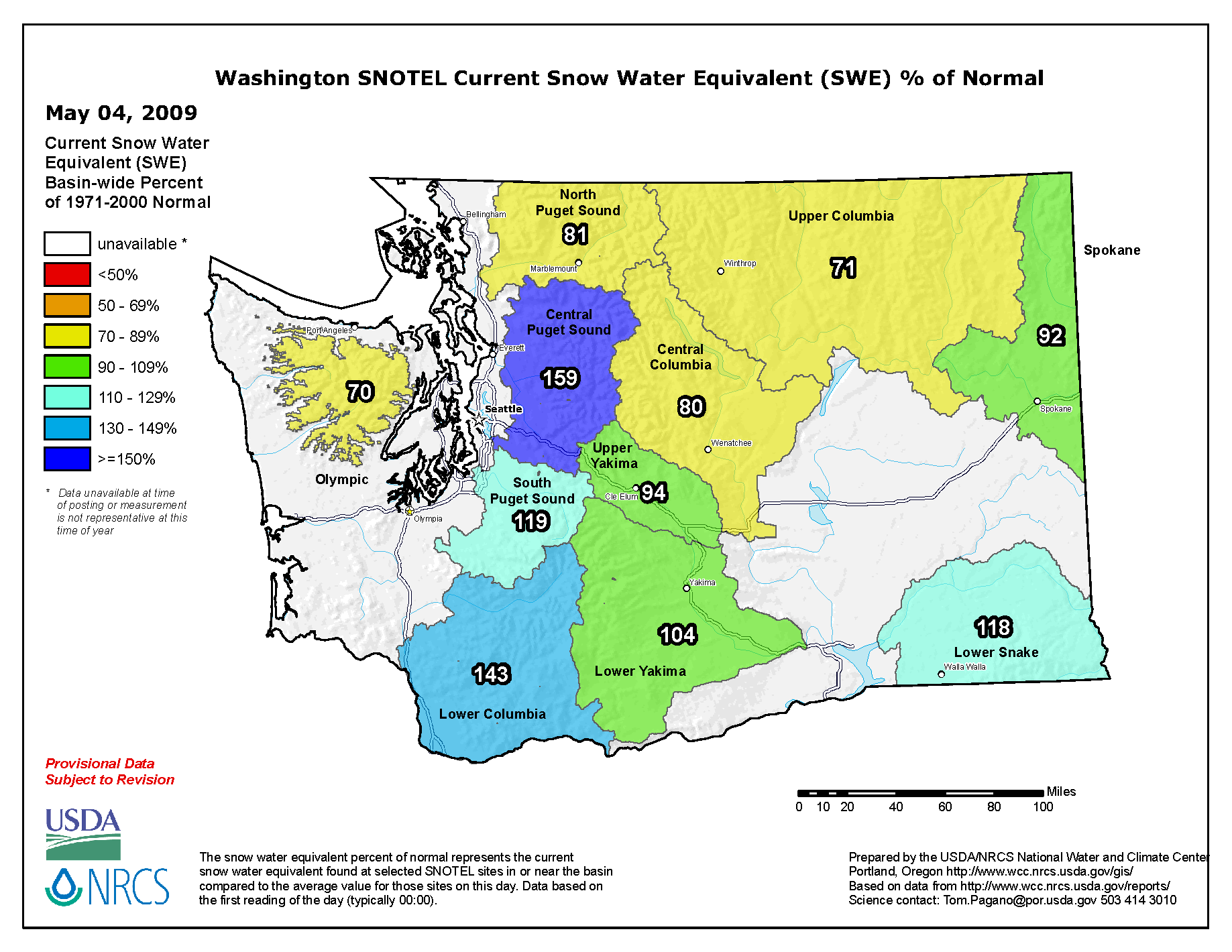 Snowpack built slowly this winter, and after a very dry February, snow water equivalent (SWE) in the northern Cascades was only between 60-65% of normal in early March. The Olympics at that point were also feeling the impacts of below normal precipitation, with SWE at 51% of normal at that time. March was cold and snowy throughout Washington, however, and snowpack built significantly in the southern Cascades to above normal amounts, but ranged between 67-77% of normal in northern Cascades and Olympics as of April 1. Surprisingly, snowpack continued to build through April, and as of the beginning of May most of the basins in WA had normal or above normal snowpack except for the North Puget Sound, Upper Columbia, Central Columbia, and Olympic Basins (Figure 1 – from NRCS) which had SWE ranging between 70-81% of normal. A string of abnormally warm days in May melted some of the snowpack early so that by the beginning of June, the North Puget Sound Basin (the western flank of the northern Cascades) was only at 58% of normal SWE while the rest of the northern Cascades were at 76% of normal, and the Olympics were at 73%.