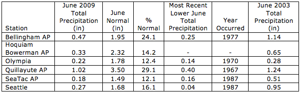 June has been remarkably dry in western WA (see Table 1), and the record for dry consecutive days in May and June was tied at Seattle-Tacoma International Airport (SeaTac AP) with 29 days this year from May 20-June 17. The dry spell started on May 20, and the period from May 20 through July 4 (46 days) of this year has been the driest recorded at SeaTac with 0.18 inches (next driest was 0.64 inches in 1965), the driest at Quillayute with 1.24 inches (next driest was 1.61 inches in 1972), the driest at Olympia with 0.23 inches (next driest was 0.40 inches in 1965), and the driest at Hoquiam Bowerman Airport with 0.40 inches (next driest was 0.78 inches in 1965).