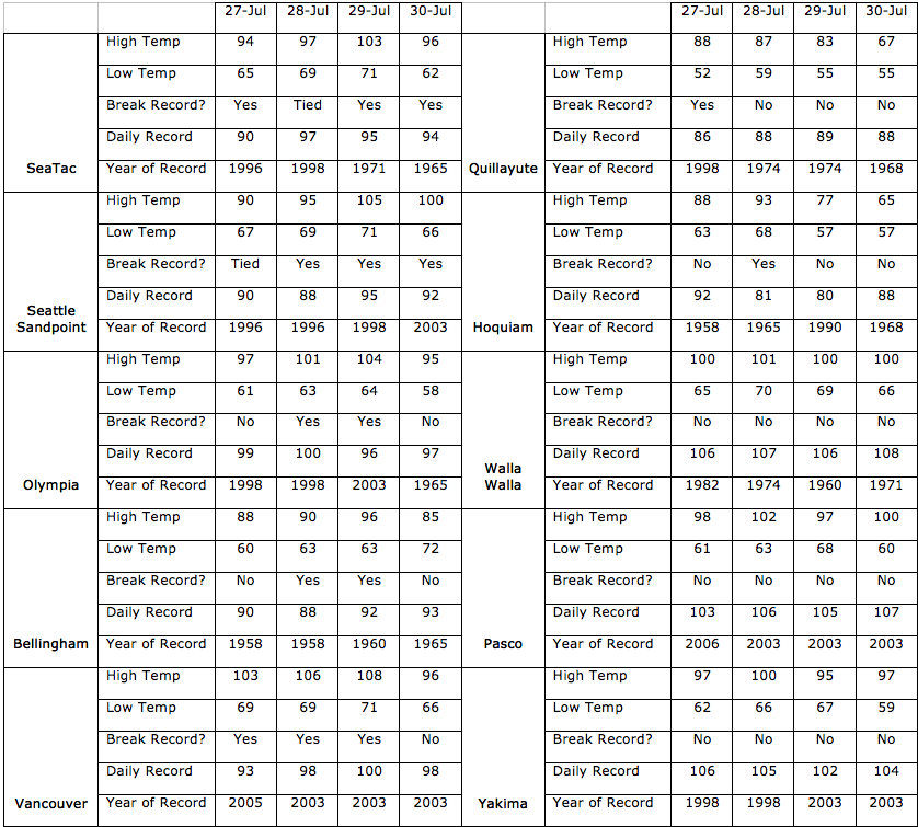 High temperatures in the 90’s were experienced in western WA on July 27, with SeaTac’s high of 94 degrees F, Quillayute’s high of 88 degrees F, and Vancouver’s high of 103 degrees F all breaking the daily record (Table 1). More daily records were tied or broken on Tuesday (July 28), including SeaTac’s high of 97 degrees F, Olympia’s high of 101 degrees F, Vancouver’s high of 106 degrees F, and Hoquiam’s high of 93 degrees F (Table 1). Perhaps even more impressive was the inability of the temperatures to cool down at night. The low temperature for July 28 at SeaTac was only 69 degrees F, tying the highest minimum temperature recorded at any time of the year. It hasn’t been that warm at night since September 2, 1974 nor at any other time since records began in 1948 at SeaTac.