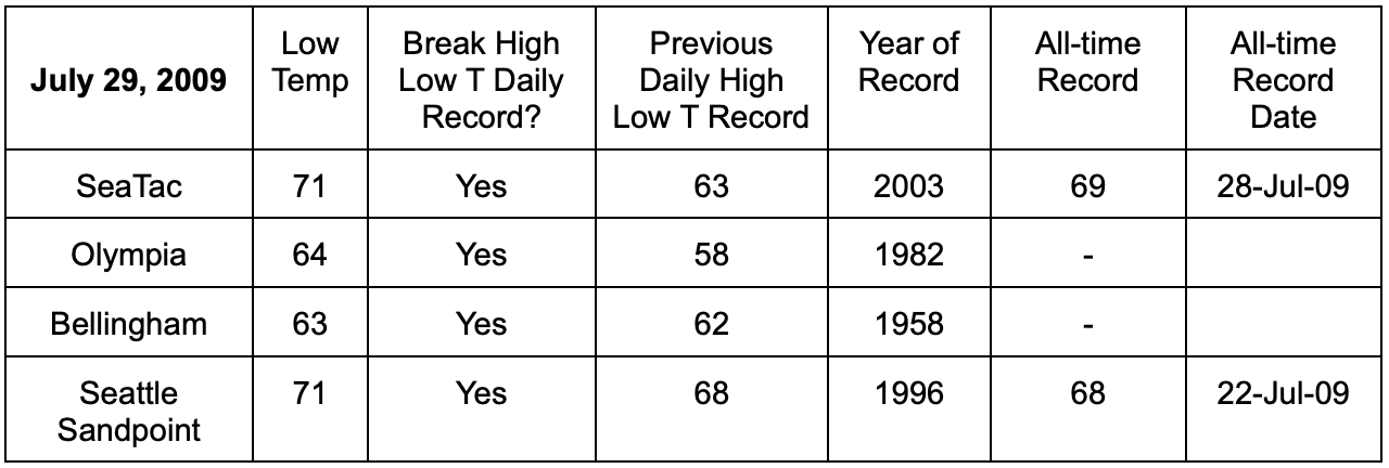 More all-time records were broken on Wednesday, July 29. The minimum temperature was even higher than the previous day at SeaTac, breaking the all-time record for highest minimum temperature. The record for highest minimum temperature at SeaTac is now 71 degrees F. Another station in Seattle (Seattle Sandpoint) broke its all-time record for highest minimum temperature that was previously set on July 22, 2006. The minimum temperature was only 71 at Seattle Sandpoint on July 29 of this year. Olympia and Bellingham had high minimum temperatures on July 29 as well, breaking daily records, but not all-time records (Table 2).