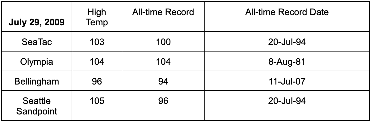 Parts of Washington, and in particular western WA, felt the heat during the last week of July. A heat wave gripped the state on Monday, July 27 and lasted through Thursday, July 30. Highs in western WA reached into the 90’s and 100’s, and daily records as well as all-time records were broken.