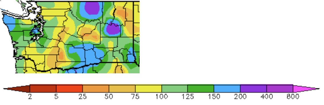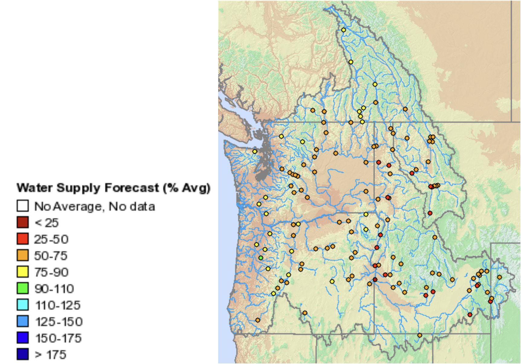 Seemingly in defiance of the calendar, a series of winter-like storms moved through WA in late March through April, and as mentioned above, brought some much-needed snow to the mountains. Nevertheless, the water supply forecast issued on April 22 is not promising though due to the deficit of precipitation earlier in the season. Figure 7 shows the summer streamflow forecast for the Pacific Northwest from the Northwest River Forecast Center and the forecasts range from as little as 25 to 90% of normal.