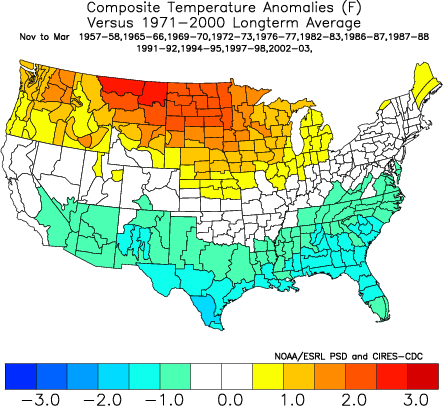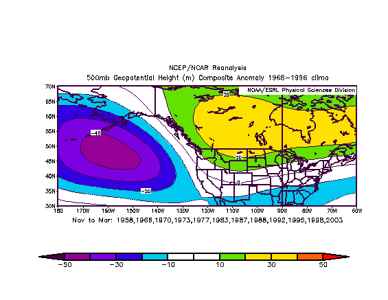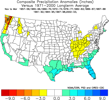 Returning to the subject of El Niño, it is worthwhile to consider how the past winter’s weather corresponds with that associated with past events. Figures 8 & 9 show the composite temperature and precipitation anomalies for past El Niño events as defined by Bond and Harrison (2006). Compared to Figures 2 & 3 [note that the color scales are different], the temperature anomalies in WA this past winter were consistent with the composite El Niño signal. The precipitation anomalies do not match quite as well with the Cascades being drier, and the Olympics being wetter than in the composite of previous El Niños. The difference can be attributed to southerly flow, which was enhanced not just during January, but also for the winter as a whole. While the temperature and precipitation anomalies in WA were more-or-less consistent with those expected during an El Niño, it is worth noting that this was not necessarily true for other areas of the United States. The northeast US, for example, was warmer this winter than usual during El Niño, and California had near-normal rather than relatively heavy precipitation. These discrepancies are consistent with the continental scale atmospheric circulation, which is summarized here with 500 hPa geopotential height anomaly maps for the past winter (Figure 10) and for the composite of past El Niños (Figure 11). Specifically, the much higher than normal 500 hPa geopotential heights over eastern Canada were associated with anomalous easterly flow over the northeastern US and a suppression of arctic-air outbreaks out of central and western Canada (if not a lack of some crippling snowstorms). Furthermore, the lower than normal 500 hPa heights over the eastern North Pacific did not extend as far as usual towards southern California, resulting in a typical rather than especially stormy winter. Though we will not go into detail here, the Arctic Oscialltion (AO) was extremely negative this past winter, and likely played a role in the deviations from a typical El Niño weather pattern in parts of the US.