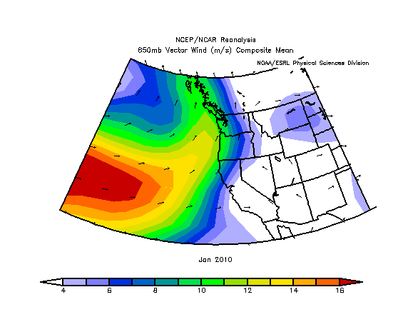 The greatest deviation from the warmer than normal winter temperatures came in early December, when an arctic air mass plunged into the state and kept temperatures at record daily lows for days at a time. Overnight lows in Olympia even dipped into the single digits for 3 consecutive days, and some overnight lows in eastern WA were below zero [Fahrenheit]. Overall, December was colder than normal by about 2 to 5 degrees F. Precipitation was also below normal for December, and even with the cold temperatures, snowpack did not build at a typical rate in the mountains. January, on the other hand, was especially warm, with temperatures anywhere from 5 to 9 degrees F above normal around the state. For many stations, January 2010 was among the warmest on record. Precipitation was below normal for the Cascades and northeastern WA, but close to normal for the lower elevations west of the Cascades. Precipitation was also above normal for parts of the Olympic Peninsula and for much of eastern WA (Figure 5). The January precipitation pattern is different than what is usually seen, and Figure 6 shows the 850 hPa mean vector wind for the month. The winds were generally out of the south, instead of the more westerly flow that is typical for this time of year. The southerly winds meant enhanced transport of moisture into eastern WA, and up the south-facing slopes of the Olympic Mountains, but also a reduction in the usual flow up the western flanks of the Cascades. The overall flow pattern was also conducive to low pressure storm systems tracking more parallel to the coast than onshore, with one consequence being an absence of strong winds in the populated regions of the Puget Sound.