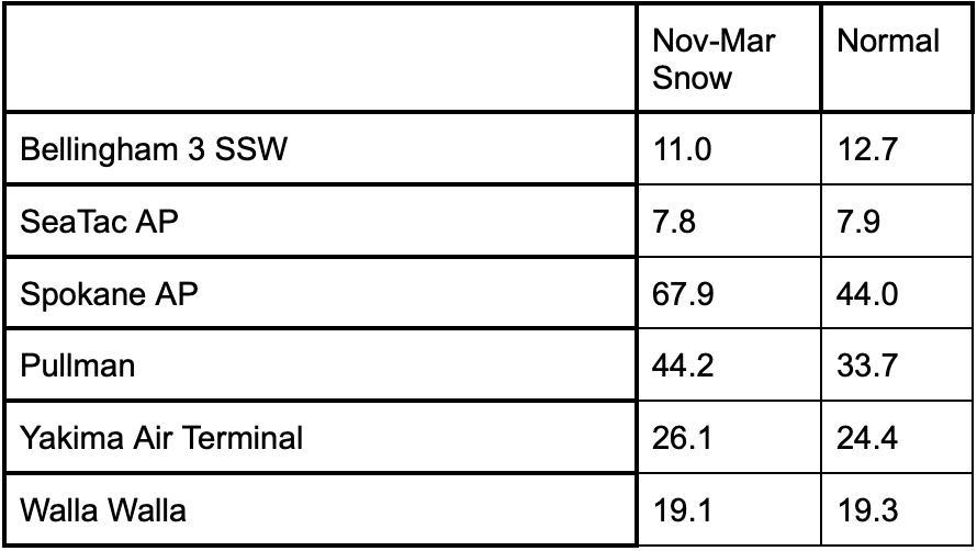 Seasonal totals of lowland snow varied around the state and did not fit into a clear pattern. Table 1 shows Nov-Mar total snow for several WA stations as well as the 1971-2000 normal. Many stations east of the Cascade Mountains had close to normal or above normal total snowfall for November through March. Seasonal snow totals tended to be near-normal on the west side of the Cascades.