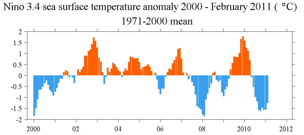 Figure 1 shows the sea surface temperature (SST) anomalies from 2000 through February 2011 in Niño 3.4 region of the equatorial Pacific Ocean. As seen in the figure, the anomalies stayed at about 1.5°C throughout the whole winter. The Niño 3.4 index indicates that this La Niña was a moderate event, and you can see in Figure 1 that the Niño 3.4 SST anomalies are on par with the ones in 2007-08. Another measure of this phenomenon, the multivariate ENSO index (MEI), classified this event as strong since its onset (more info). In terms of the MEI, the anomalies during the present case have kept pace with those of the 6 strongest La Niña events in the historical record. The event is weakening in both indices, and conditions are expected by the Climate Prediction Center to return to near neutral by the summer.