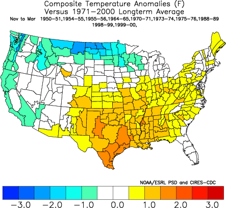 Figure 2: Composite Nov-Mar temperature anomalies (Fahrenheit) for the past La Niña events (from ESRL).