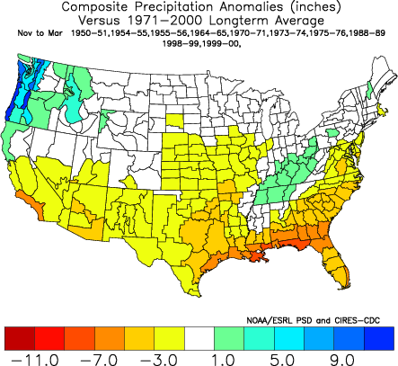 Figure 3: Composite Nov-Mar precipitation anomalies (inches) for the past La Niña events (from ESRL).