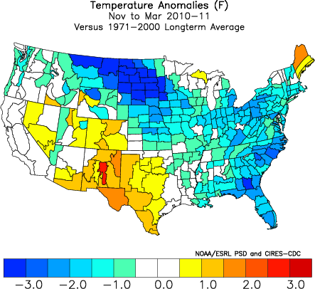 Figure 4: Nov-Mar temperature anomalies (Fahrenheit) from the 1971-2000 normal for the 2010-2011 winter (from ESRL).