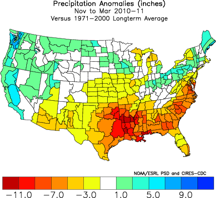Figure 5: Nov-Mar precipitaion anomalies (inches) from the 1971-2000 normal for the 2010-2011 winter (from ESRL).