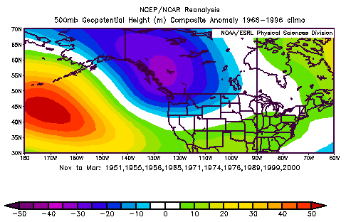 Figure 6: 500 hPa geopotential height anomalies from November through March for past La Niña events from ESRL.