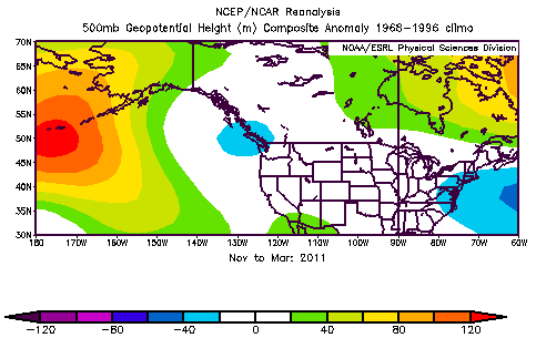Figure 7: 500 hPa geopotential height anomalies from November 2010 through March 2011 from ESRL.