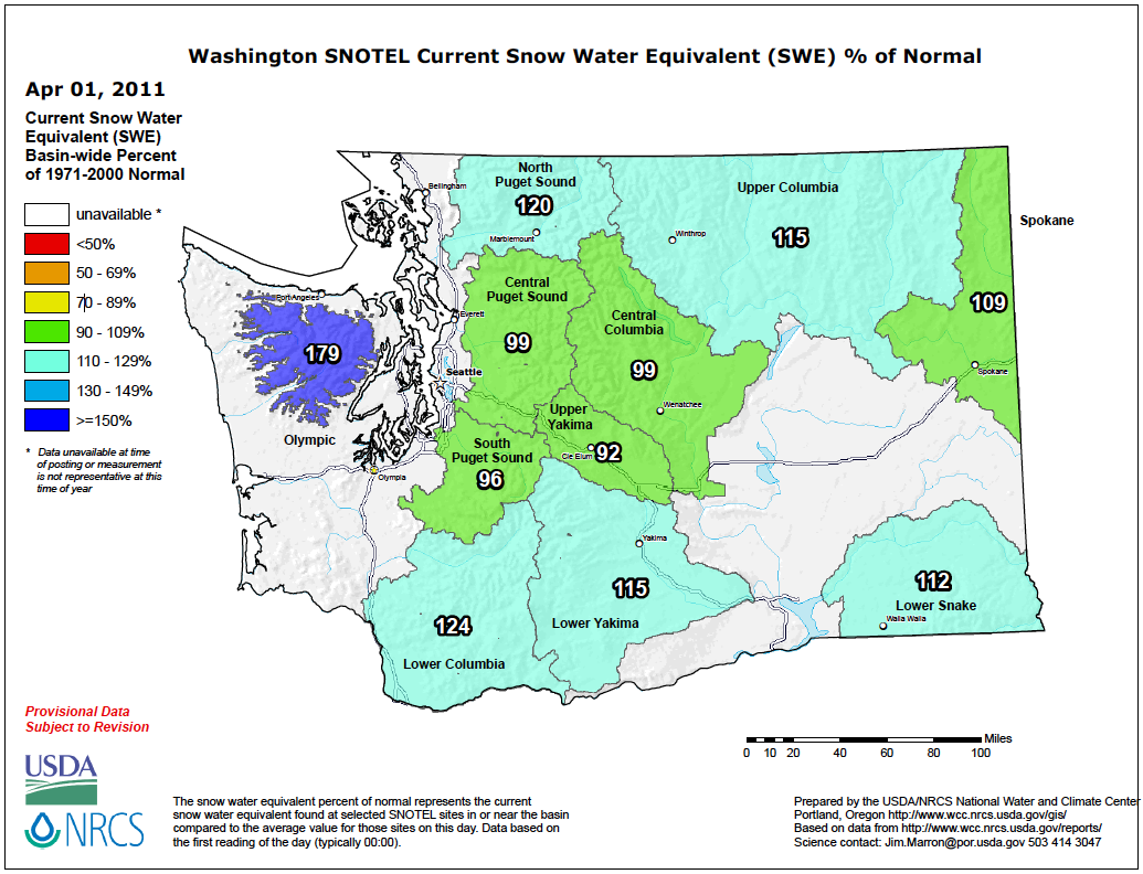 Figure 8: Snowpack (in terms of snow water equivalent) percent of normal for WA as of April 1, 2011 (from NRCS). Please click on the figure to see the full-size image.