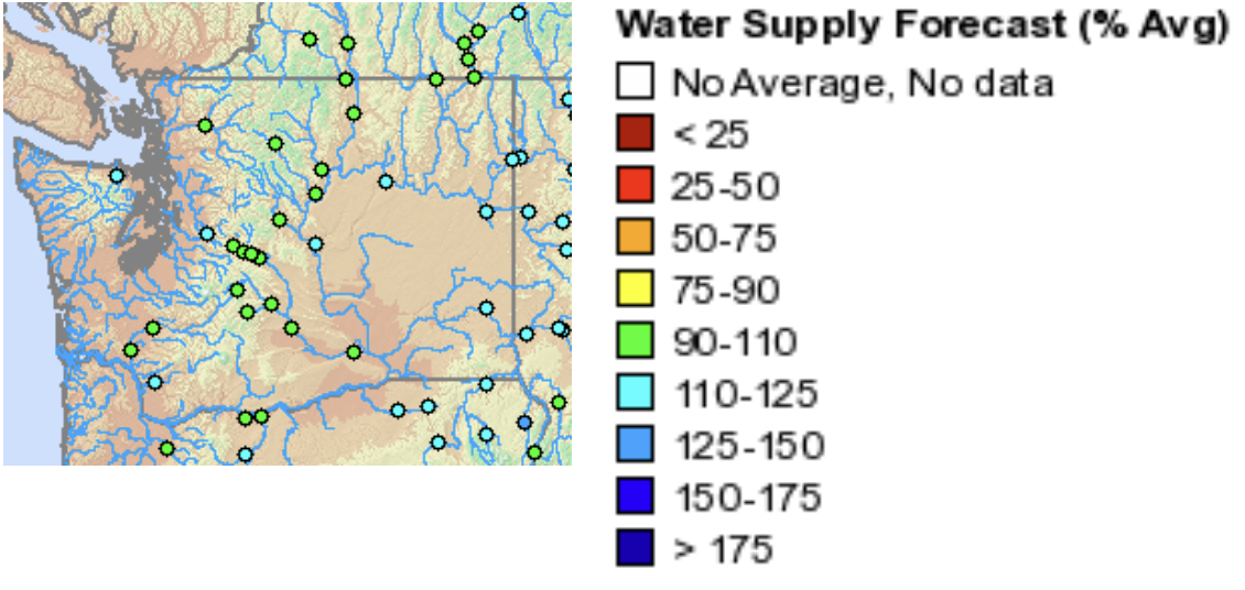 Snowpack statewide built to normal to above normal depths from the end of February through March. The April 1 percent of normal snow water equivalent (SWE) from the National Resources Conservation Service is shown in Figure 8. The Olympics, north Cascades, south Cascades, and the Blue Mountains all have above normal SWE while the central Cascades and the Spokane basin are near normal. This is good news for the summer water supply, and the Northwest River Forecast Center’s March 31 water supply forecast (Figure 9) projects streamflow from now through September to be normal (90-110%) to above normal (110-125%).