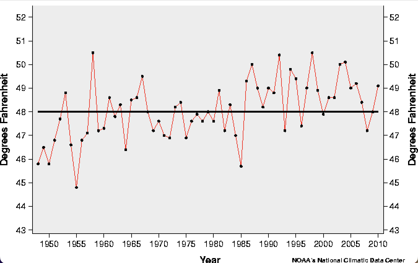Figure 2: Annual average temperatures for WA from 1948 through 2010 from the National Climatic Data Center.