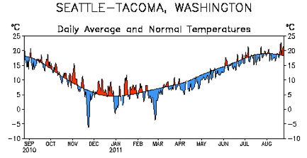 Figure 1a: Temperature departures from normal for the last 12-months for Seattle from the Climate Prediction Center.