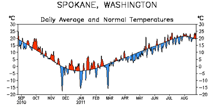 Figure 1b: Temperature departures from normal for the last 12-months for Spokane from the Climate Prediction Center.
