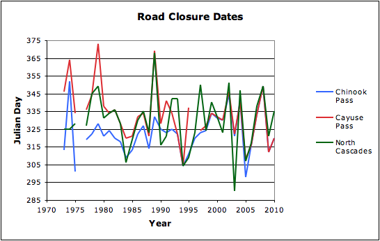 Figure 1: Dates of seasonal closures (Julian day) of the North Cascades Highway, Cayuse Pass and Chinook Pass for the years 1973-2010 from the Washington State Department of Transportation (https://wsdot.com/travel/real-time/mountainpasses/).