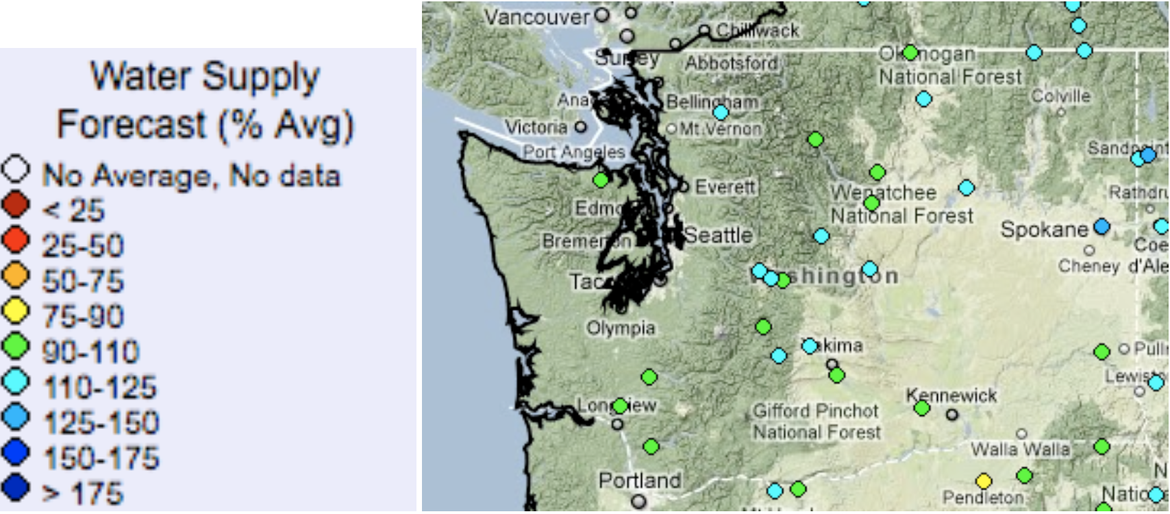 As mentioned above, snowpack lagged behind normal during mid-winter with the dry conditions in December, but rebounded to much above normal at the time of this writing. In fact, April 2 snow water equivalent (SWE), shown in Figure 8, is higher than at this time last year. However, there is no indication that heavy snow will persist into April this year, like what occurred in 2011. The National Weather Service Northwest River Forecast Center April through September water supply forecast projects normal (90-110% of normal) to greater than normal (110-150% of normal) streamflow for the entire state (Figure 9).