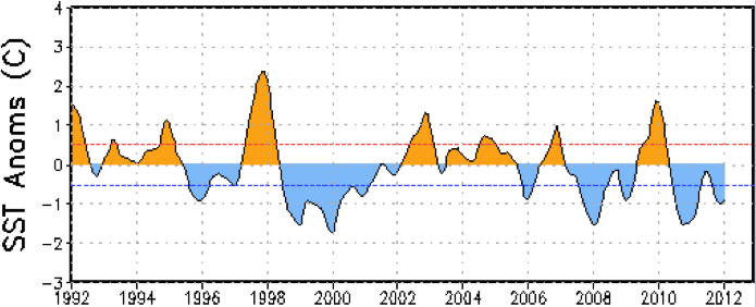 Figure 1: SST anomalies from 1992 through January 2012 in the Niño 3.4 Region of the tropical Pacific (from CPC). Please click on the figure to see the full-size image.