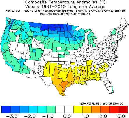 Figure 2: Composite Nov-Mar temperature anomalies (Fahrenheit) for the past La Niña events (from ESRL).