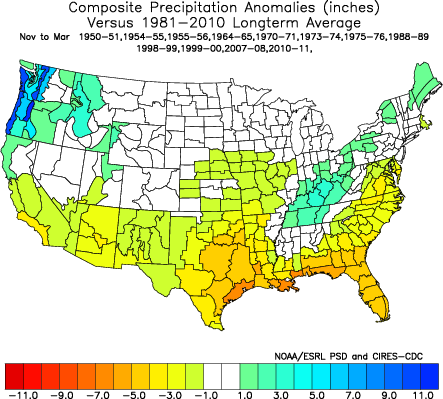 Figure 3: Composite Nov-Mar precipitation anomalies (inches) for the past La Niña events (from ESRL).