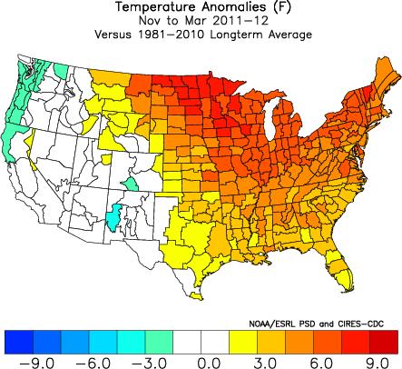 Figure 4: Nov-Mar temperature anomalies (Fahrenheit) from the 1981-2010 normal for the 2011-2012 winter (from ESRL).