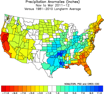 Figure 5: Nov-Mar precipitaion anomalies (inches) from the 1981-2010 normal for the 2011-2012 winter (from ESRL).