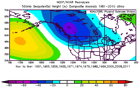 Figure 6: 500 hPa geopotential height anomalies from November through March for past La Niña events (from ESRL).