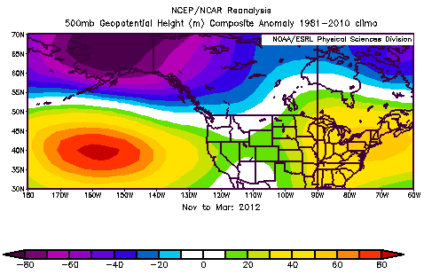 Figure 7: 500 hPa geopotential height anomalies from November 2011 through March 2012 (from ESRL).