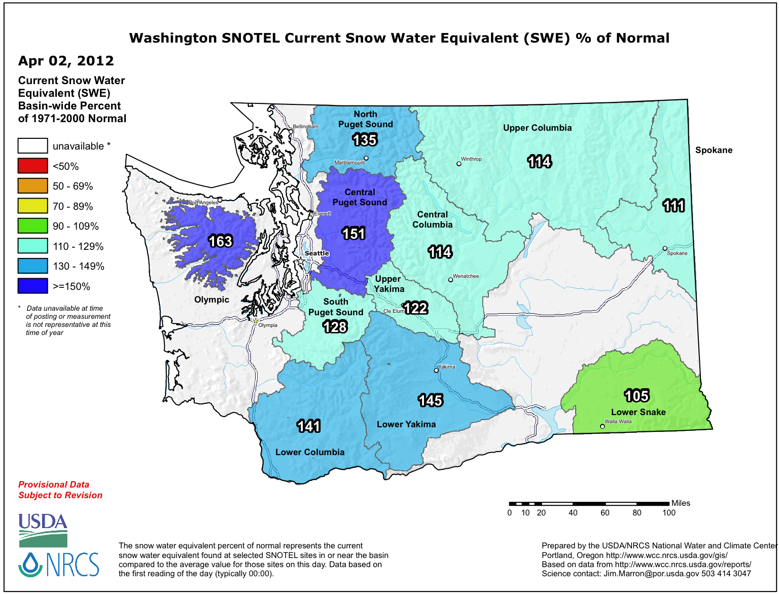 Figure 8: Snowpack (in terms of snow water equivalent) percent of normal for WA as of April 2, 2012 (from NRCS). Please click on the figure to see the full-size image.