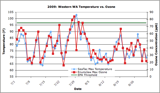 Our analysis is based on the following data: (1) daily maximum 8 hr O3 concentrations from Enumclaw (Mud Mountain Dam) and Spokane for 2000-2011 from the Puget Sound Clean Air Agency, and (2) daily maximum air temperatures from SeaTac (SEA) and Spokane International Airport (GEG). We use the O3 record at Enumclaw because it is a location that is out of compliance with the EPA standard relatively frequently. Comparisons between the daily maximum air temperatures and O3 concentrations for the two pairs of sites were made for the months of July and August during both cool and warm summers; for brevity’s sake results are shown here just for the warm summer of 2009. We also examined the values of peak O3 concentration during heat waves in the Seattle area, arbitrarily defined as those periods during which temperatures at SEA reached 90 F or higher.