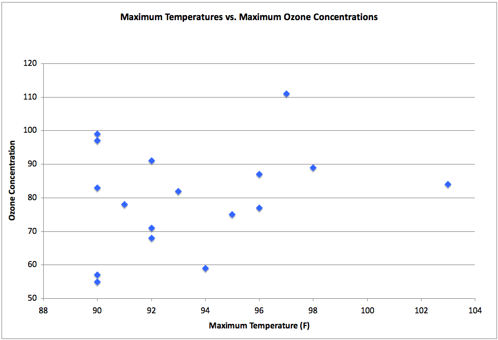 It is clear that unseasonably warm and sunny days are typically accompanied by elevated ozone levels. But are the very hottest days necessarily the most polluted? The scatterplot of maximum air temperature at SEA versus maximum O3 concentration at Enumclaw for all of the heat waves at SEA since 2000 (Figure 2) suggests otherwise. There have been 5 of these heat waves for which the peak temperature was 90 F, and the maximum O3 concentrations have ranged from 55 to 99 ppb, i.e., from the lowest to the second-highest in the set. The all-time record heat of July 2009, including a 103 F at SEA, was accompanied by elevated O3, but six other heat waves in the last decade had higher levels. The time series for 2009 shown in Figure 1a hints at a possible explanation. Specifically, note that a somewhat lower value of maximum O3 was recorded at Enumclaw on the hottest day at SEA (29 July). During that particular day, southeasterly winds were observed at North Bend, WA in the Cascade foothills, while 28 and 30 July had winds from the northwest (not shown). It appears that air originating from the urban portion of the Puget Sound did not make it all the way into the foothills on 29 July. As an aside, stations near the Sound such as SEA and Boeing Field had northwesterly winds on all three afternoons. It makes sense that the details in air trajectories would be important to the peak O3 concentrations in any particular spot, but a complete analysis is well beyond our present scope. The bottom line is that the hottest days do not necessarily have the very highest O3 concentrations.