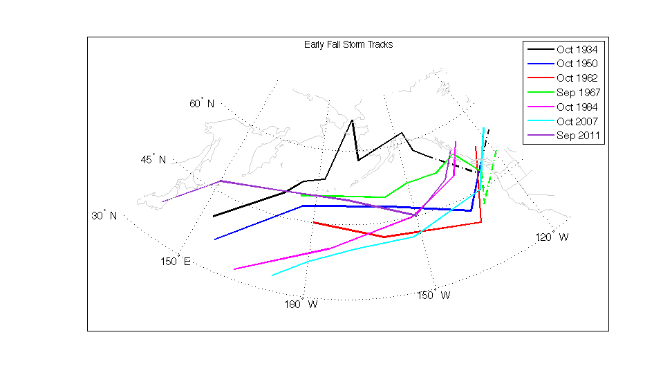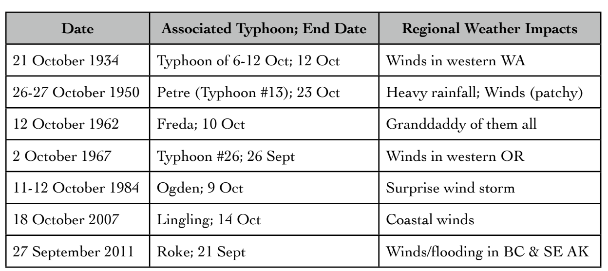 The point we wish to make here is that the tropical origins for our early fall storms may be more common than previously appreciated. This finding raises a couple of questions. The western North Pacific is a hotbed for tropical cyclones, and plenty of them recurve into the westerlies. So what is special about the few that survive the trek across the Pacific? In addition, the tropical cyclone season in the west Pacific usually lasts into November, as the mid-latitude storm track is really cranking up. Do our November storms also frequently have connections to west Pacific typhoons or are there factors, perhaps associated with the background flow, that work against it? As a bit of an aside, the storm of 2 November 1958 was also examined, since it was rather early in the season, and because of Wolf Read’s analysis, which indicated it had signatures of a warm-core tropical storm system. The interesting result here is that it was the only case examined that appeared to lack a linkage to a west Pacific typhoon. The bottom line is that we think our results are intriguing but emphasize they are also tentative. It does motivate keeping an eye on what is happening west of the dateline.