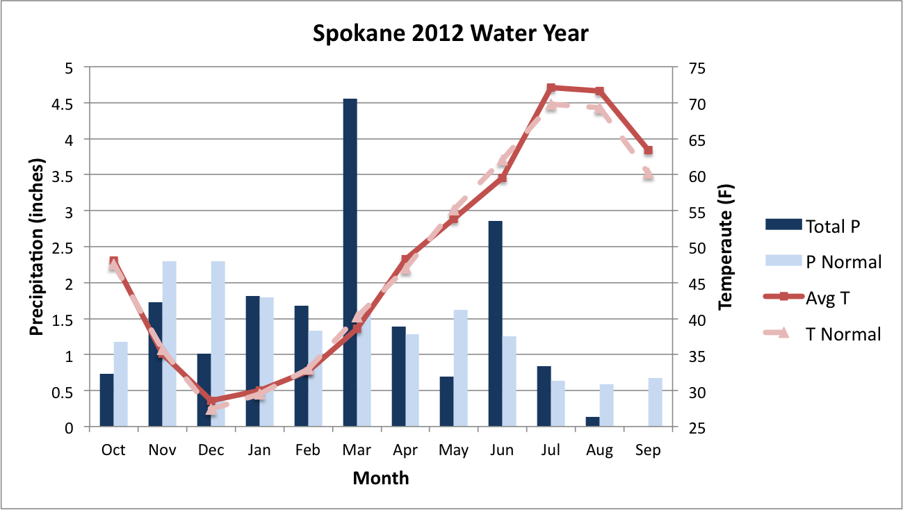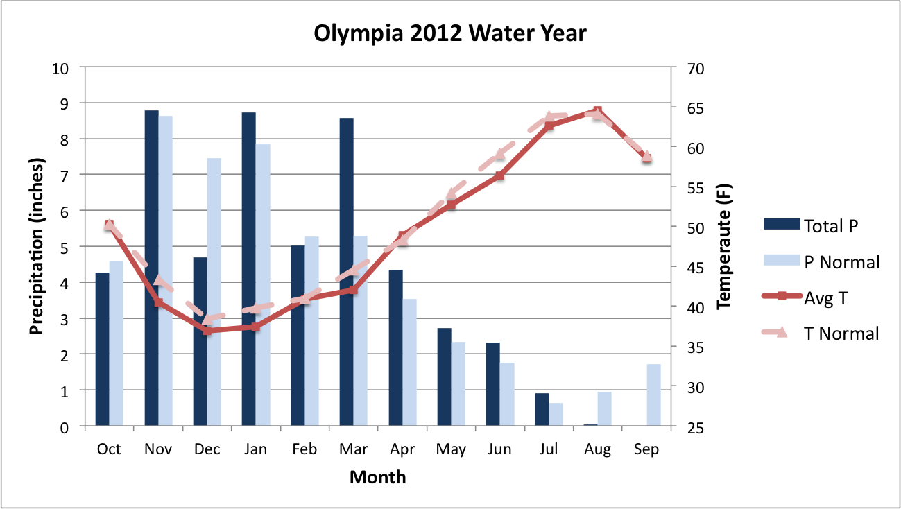 A water year in the Pacific Northwest begins on October 1 and ends on September 30, and is labeled by the year it ends in. According to the American Meteorological Society’s Glossary of Meteorology, “It commences with the start of the season of soil moisture recharge, includes the season of maximum runoff […] and concludes with the completion of the season of maximum evapotranspiration”. In other words, it starts around here at the start of the beginning of our wet season. As we begin our journey into the 2013 water year, it is worth taking a look back at the temperature and precipitation for water year that just ended.
