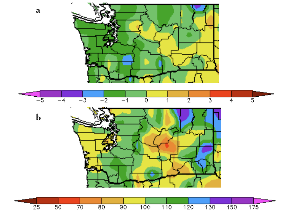 How does the 2012 water year (WY) compare to normal? Figure 1 shows the 2012 WY average temperature departure from normal and the total precipitation percent of normal (based on the 1981-2010 normal period) for WA State. Generally, western WA was colder and wetter than normal for WY 2012, except for the Olympic Peninsula where conditions were just barely on the dry side. Eastern WA experienced more variety in precipitation, with northeastern WA and southeastern WA wetter than normal while the Columbia Basin was drier than normal. Regarding temperature, the far northern and far southern portions were cooler than normal while the remaining eastern WA locations had above normal WY temperatures.