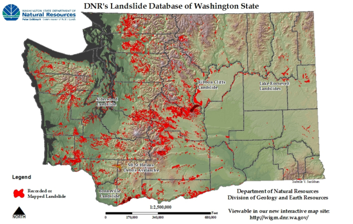 Much of Washington state features steep terrain and unconsolidated soils, which means that landslides are a regular part of the landscape. And since many of these slides are associated with heavy rainfall, they occur more often in the winter, with plenty of exceptions. Of course they can also be triggered by a variety of other agents such as earthquakes, volcanic eruptions, water level changes, and human activities; here we focus on landslides associated with the weather. The purpose of this piece is to provide a brief discussion of their causes and relevant factors, summaries of some recent notable events, and some links for more information.