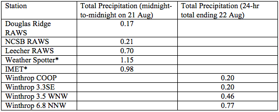 Table 1: Total daily precipitation measurements (inches) in the region. The RAWS sites measure precipitation from midnight-to-midnight so the observations are dated 21 August. The remaining sites are 24-hour precipitation measurements ending on the morning of 22 August, and mostly come from the CoCoRaHS network. The exception is Winthrop COOP which reports at 2 pm. *The observations from the weather spotter and incident-meteorologist were taken over an hour on 21 August, and are not daily totals.