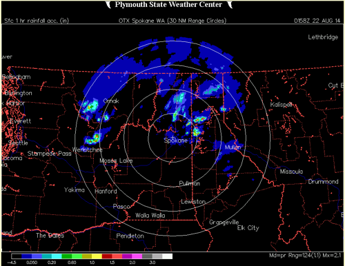 Figure 1: 1-hour rainfall accumulation from the Spokane (OTX) radar ending at 6:58 pm on 21 August 2014. Please click on the figure to see the full-size image. [Image from the Plymouth State Weather Center].