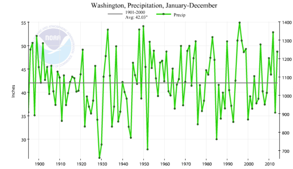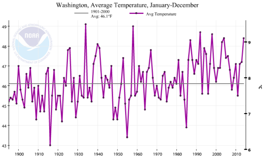 According to the National Climatic Data Center (NCDC), the mean temperature for the state during 2014 was 48.2°F, which is 2.3°F above the 20th century average. This ties 2004 as the 5th warmest year since 1895 (Figure 5). Several recent years have comparable statewide temperatures to 2014, namely 1992, 1998, and 2003, but the record warmest year for WA remains the Dust Bowl year of 1934. Precipitation during 2014 averaged across the state is estimated at 48.73”, which is 6.70” above the 20th century average but still more or less in the middle-ofthe-pack when compared to the historical record (Figure 6). With respect to recent years, 2014 was wetter than 2013, but not as wet as 2012. Of course one size does not fit all, and in particular, the Columbia basin of eastern WA was slightly dry on the heels of the quite arid year of 2013. This resulted in adverse impacts on dryland farming (e.g., wheat yields) and soil moisture levels remain sub-par in this part of the state.