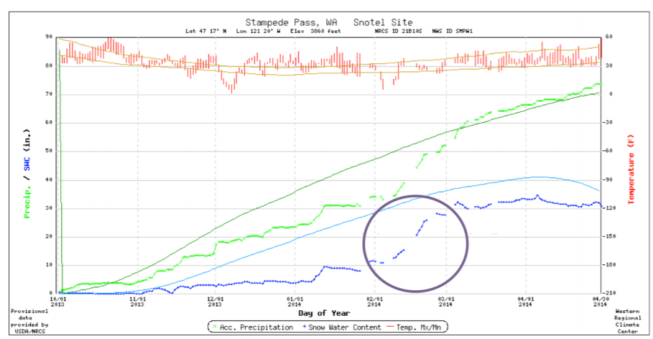 1). Great Snowpack Comeback Winter – 2013-14 began very dry with low snowpack, leading to concern for the water supply for the following summer. In early February, the basin average percentages of normal snow water equivalent (SWE) were between 51 and 66%. A major shift in the weather pattern occurred in mid-February: heavy precipitation and colder than normal temperatures through the remainder of the month helped the snowpack situation immensely. The growth in snowpack was impressive with SWE throughout much of the Cascades ranging between 92 and 105% of normal by early March. The snow depth on Hurricane Ridge in the Olympic Mountains, for example, doubled from Feb 1 (32”) to Mar 1 (64”). Figure 7 shows the season’s SWE trace at Stampede Pass, with ~20” increase during the month of February.