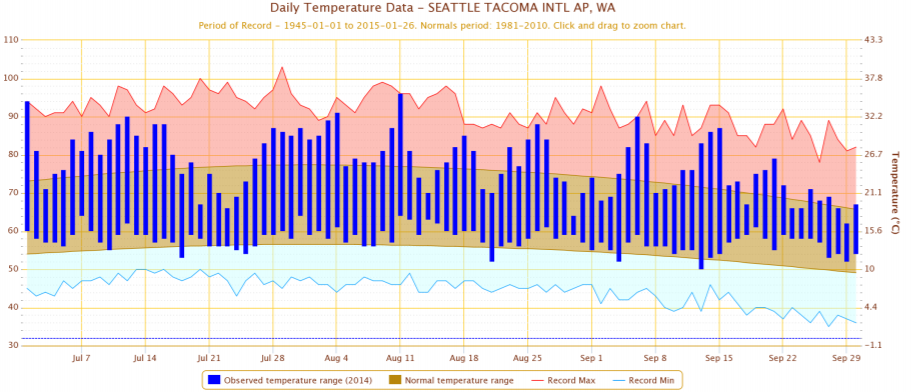 3). Warm July-September – The summer of 2014 was consistently warm throughout Washington. Averaged statewide, the July through September period was the 3rd warmest on record with an average temperature of 65.2°F, 3.7°F above the 20th century average. Only 1998 and 1967 were warmer by that measure. Figure 8 shows the maximum and minimum temperatures for SeaTac Airport during that time period, where the average temperature was the 2nd warmest on record. It’s worth noting that the maximum temperatures are frequently above normal, but not often near the record maximum (red line). In other words, it lacked many extreme heat events. In terms of minimum temperatures, the statewide average during July through September in 2014 tied the all-time record set in 1998. This was a consistent feature of the summer weather, as illustrated by the record at SeaTac Airport, where it dipped below the average minimum temperature on only about a half-dozen nights (Fig. 8). The balmy nights were at least in part associated with higher than normal humidity, which relates to the next element.