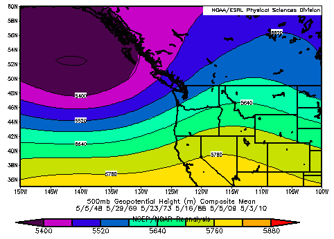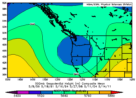 But does that mean that the circulation patterns associated with the heaviest rains in May are similar on the two sides of the Cascade Mountains? The regional distributions of 500 hPa geopotential height (Z) and sea level pressure were examined for each of the days in Table 1, and it became apparent that much different set-ups occur during the rainiest days in western versus eastern Washington state. A composite 500 hPa Z map for the 6 western cases (Figure 1) shows a winter storm pattern with moderate-strong westerly flow. Relatively minor differences were found among the individual cases. The composite 500 hPa Z map for 6 eastern cases is shown in Figure 2. This composite includes 27 May 1998, during which Winthrop received its second highest total of 1.10”, to the 5 days listed in Table 1 because the event of 14 May 2011 constituted record amounts at both Wapato and Winthrop. The 500 hPa Z distribution for the eastern cases is very different. These cases are typically associated with an upper-level low near the coast and weak southeasterly flow over eastern Washington. One of the cases in this composite was kind of an oddball; 2.19” rain fell in Spokane on 21 May 2004 with weak northwesterly flow at 500 hPa. Thunder was reported during this event, and in general, the pattern for the eastern cases is much more akin to that associated with summer thunderstorms than the winter-type disturbances that cause the heaviest May rains on the west side.