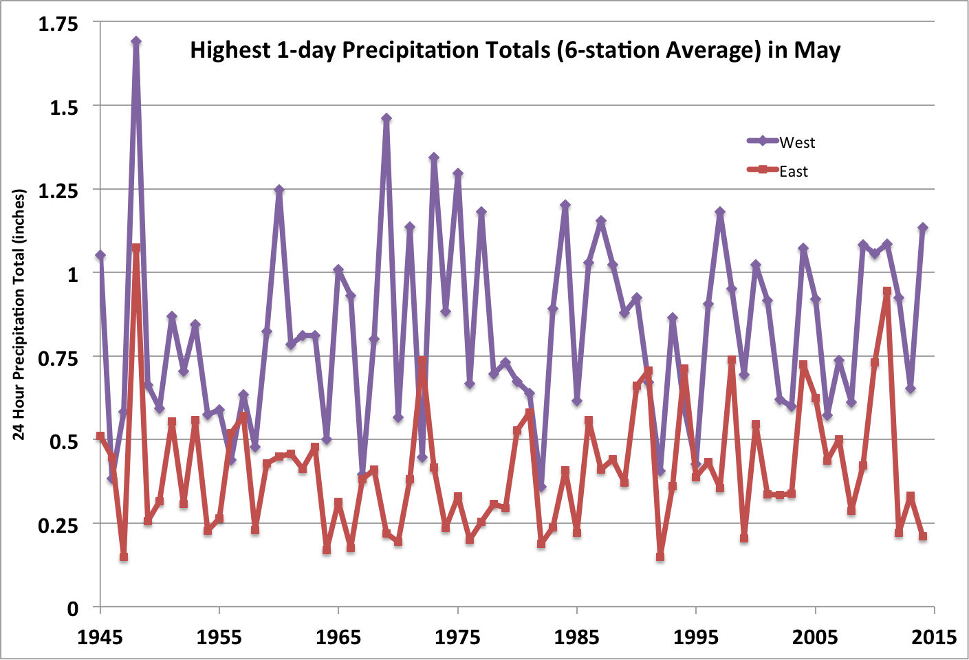 The trends in the intensities of the heaviest May rains were assessed in the following manner. We again considered 1-day precipitation amounts during May for the same sets of 6 western and 6 eastern stations. The top values during each May from 1945 through 2014 was determined for each station and used to form 6-station averages, yielding representative measures of the greatest 1-day rain of the month for the two sides of Washington state. The time series of these averages for the western and eastern stations are shown in Figure 3. Our interpretation of these time series is that there is no discernible trend in the intensity of May rains in western Washington. There may be a slight tendency for heavier May rains in eastern Washington; the frequency of years with relatively high values has been greater since roughly 1990. We recognize that our analysis is far from comprehensive. Nevertheless, both the results shown here, and monthly precipitation records (as can be explored with the featured application on the OWSC web page: http://www.climate.washington.edu/trendanalysis/ ) indicate that year-to-year variations are dominating secular changes in the precipitation in Washington state.