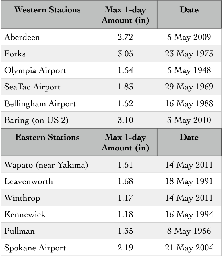 The results shown here are based on daily values of precipitation from station data; 6 stations each in western WA and eastern WA representing different parts of the state. The stations have relatively complete records of daily precipitation data back to 1945 and were picked for their geographic coverage. Mountain foothills stations were included in both the western group (Baring) and the eastern group (Leavenworth and Winthrop). Table 1 itemizes the amounts and dates of the record 1-day precipitation at the twelve stations for the month of May. We were struck by how much it can rain in a day in eastern Washington.