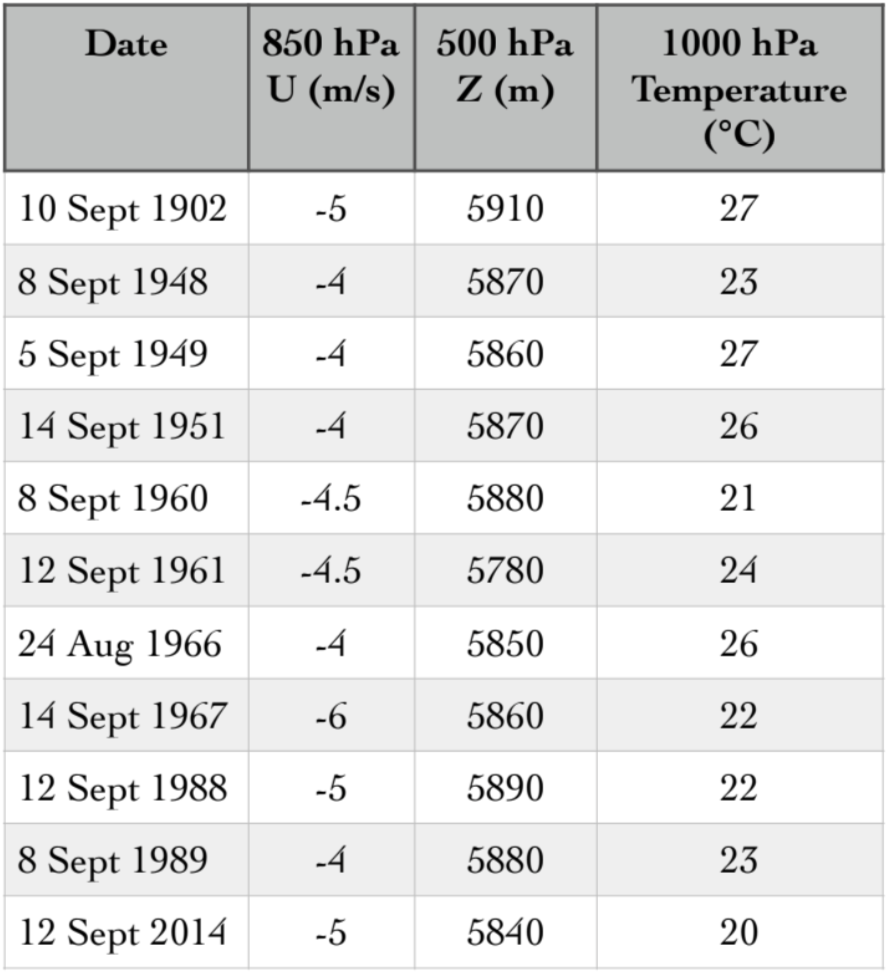 As indicated above, the zonal winds at 850 hPa are used to ascertain when conditions comparable to those of the Yacolt Burn have occurred in recent decades. Specifically, 3-day average values of the zonal winds at 850 hPa in SW WA were computed during the period of 15 August through 15 September for the years 1948 through 2014. The 3-day periods with the 10 strongest mean easterly flow were examined individually. The table below itemizes the dates of these events, and approximate values for the 3-day means of the easterly flow at 850 hPa, peak magnitude of 500 hPa ridge, and 1000 hPa air temperature.