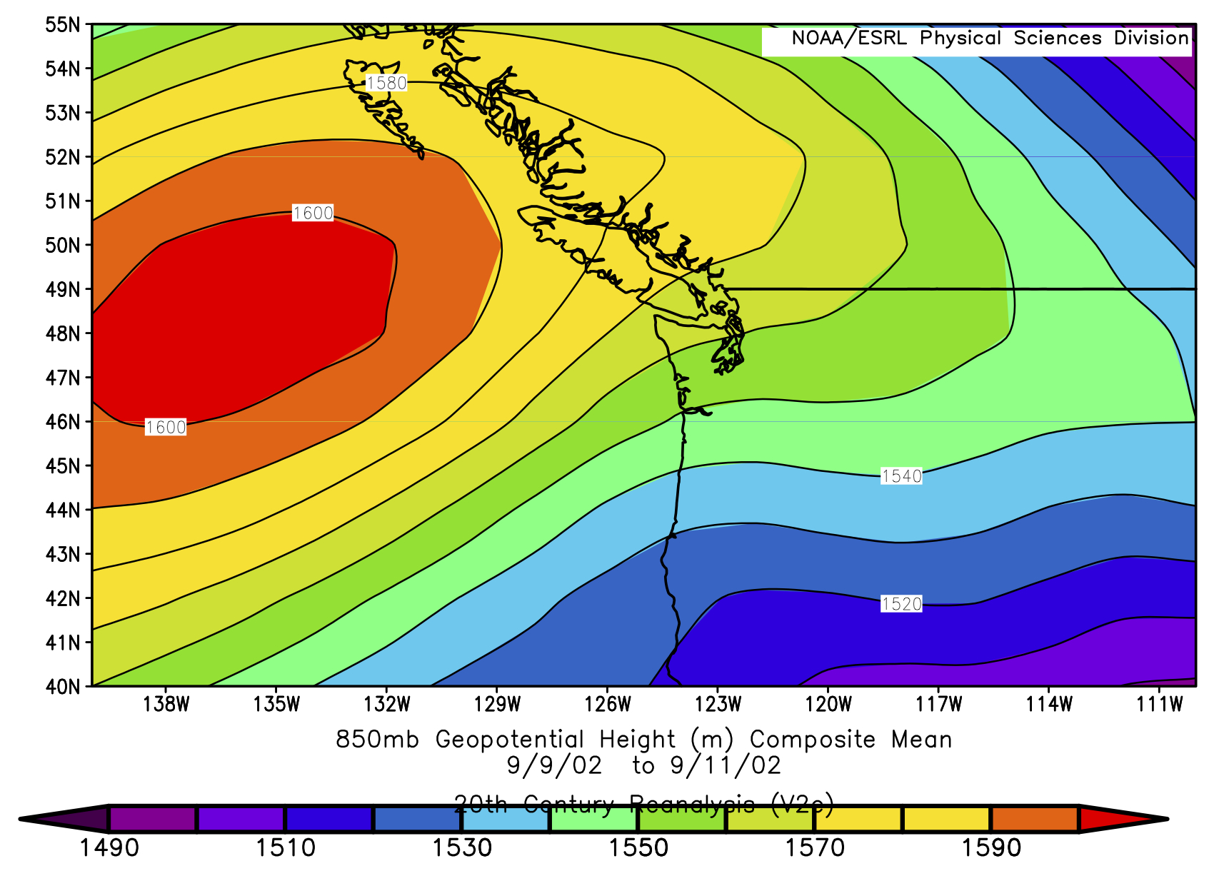 The NCEP 20th Century Reanalysis is used to document the regional flow at 850 hPa for the Yacolt Burn, and to identify other strong easterly events in the recent record (back to late 1940s). This product has a coarse spatial resolution and cannot be used to specify details in the specific location of the fire. Presumably it is suitable for comparing regional aspects of the circulation during the Yacolt Burn with similar events in the historical record. The distribution of mean 850 hPa geopotential height (Z) for the 3 days of 9-11 Sept 1902 is shown in Fig. 1. This pattern was associated with a mean easterly wind of ~5 m/s in the general region of the fire. There was also a thermally-induced trough of low sea level pressure (SLP) at the coast (not shown); a hint of this feature is in the 850 hPa Z map included here.
