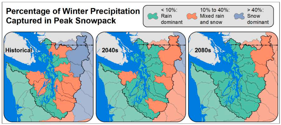 Warming temperatures will almost certainly lead to changes in the timing of streamflow in many area rivers. Western WA has three basic types of rivers: rain-dominant, “transient”, and snow-dominant. Low-elevation watersheds will continue to receive the vast majority of their precipitation as rain, with both average and peak flows remaining generally highest in winter during the wet season. Transient rivers, which now experience high flows in winter (especially during periods of warm, wet weather) and spring (due to snowmelt) will undergo a transition to seasonal cycles of present rain-dominant streams. And the hydrographs of present snow-dominant rivers, such as the Sauk and upper Skagit, are apt to resemble those of present transient rivers. The reproductions of Figures 3-1 and 3-2 from the report included here (Figures 1 and 2) illustrate these changes in streamflow that are expected in future decades.