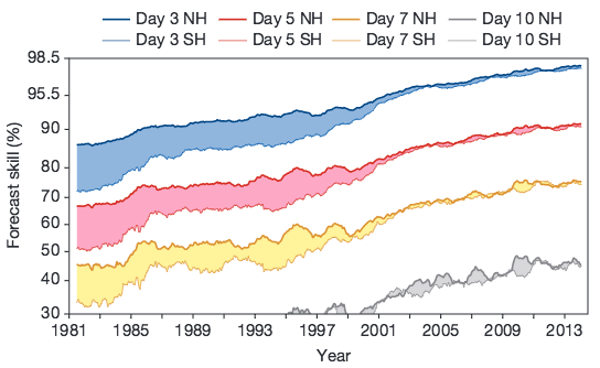 There are two basic types of meteorological forecasts. On shorter time scales, present atmospheric conditions can be used to predict spatial and temporal details in the evolution of the atmospheric flow and associated weather. Current generation numerical weather prediction (NWP) models typically demonstrate considerable skill out 3-7 days (e.g., Bauer et al. 2015), with large improvements in skill made over the past 4 decades (Figure 1). On longer time scales, months to about a year, forecasts key on mean patterns accompanying slowly varying boundary conditions for the atmosphere, such as sea surface temperature and soil moisture. Characterization of the temporal variability in the circulation and weather is not feasible beyond the period when initial atmospheric conditions play a dominant role. That leaves a gap between short-term weather forecasts and longer-term seasonal projections.