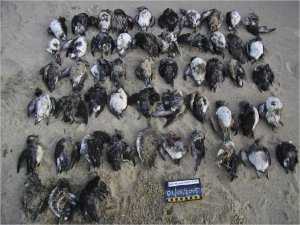 Why were there so many dead Cassin’s auklets on beaches during the winter of 2014-15? Variations in carcass counts occur for four basic reasons: (1) overall populations related to recent breeding success, (2) the weather in their foraging region (strong storms are associated with elevated mortality rates), (3) habitat expansion/contraction (birds dying nearer the coast are more likely to be beached), and (4) the availability of suitable prey/feeding conditions. During the winter of 2014-15, all of the factors except for (2) appear to have played a role. Regarding (1), there was enhanced breeding success in prior years, leading to a relatively high number of younger birds. With respect to (3), there was almost certainly compression of the suitable habitat for Cassin’s auklets due to water of more moderate temperatures near the coast. It is apparent, however, that the primary factor was the lack of food. Specifically, these birds target krill and other zooplankton, and to a certain extent forage fish, that are adapted to cooler water. These species were in short supply; the much warmer than normal water meant a preponderance of sub-tropical species at lower trophic levels that are generally less nutritious. This had implications not just for the Cassin’s auklets but rather for the entire ecosystem. For example, juvenile salmon prefer many of the same species, and the salmon that went to sea in 2015 found slim pickings. As a result, coho salmon returns in 2016 are expected to be lower than normal (Northwest Fisheries Science Center).